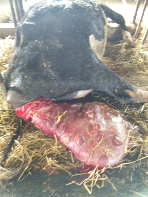 朝、牛舎へ来てみたら、写真のごとくの子宮脱。