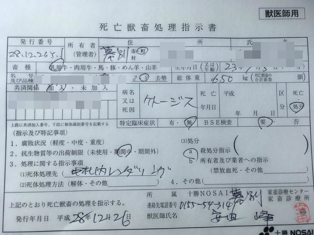 死亡・廃用野診断書を書いた牛というのは